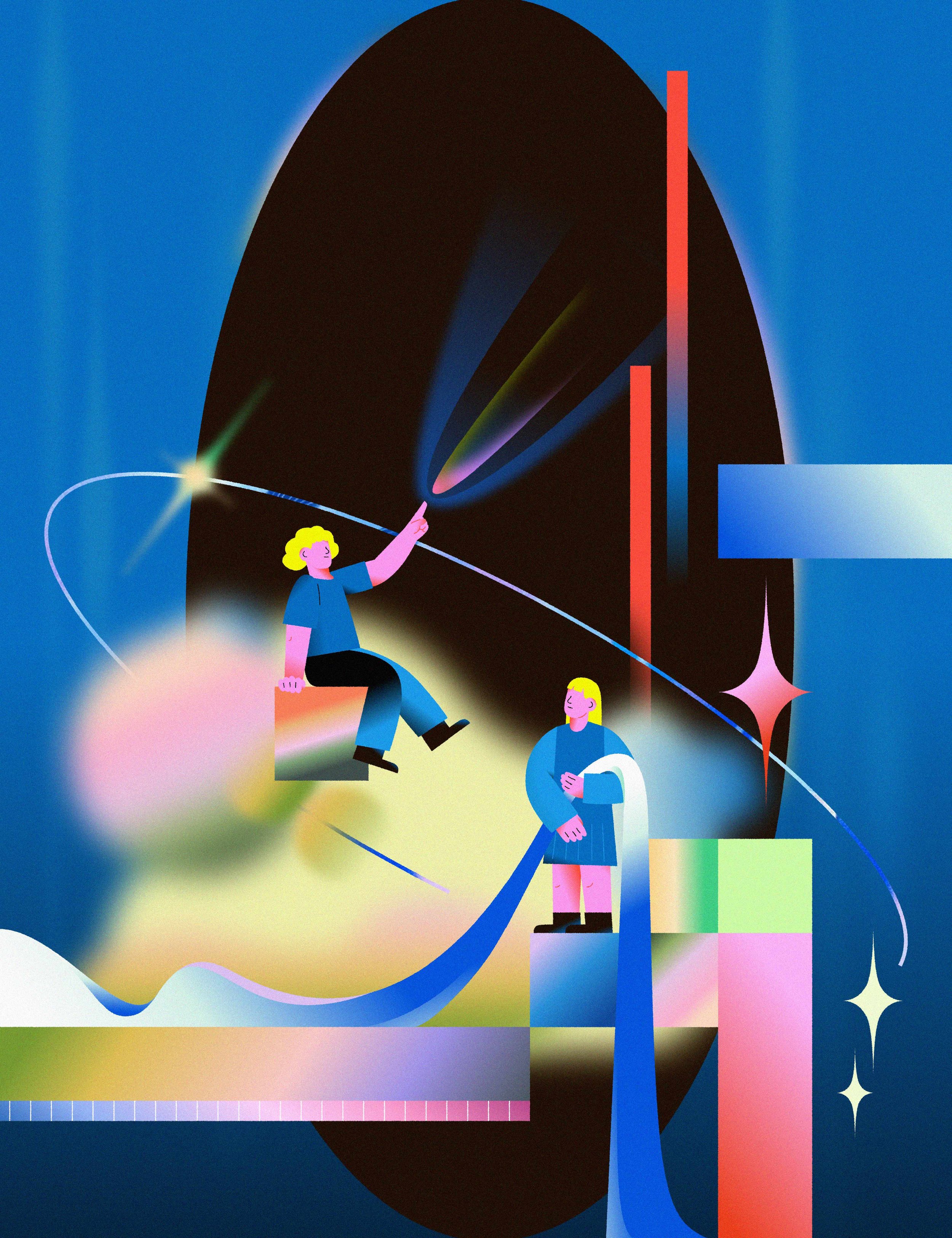Illustration for an article exploring how people navigate digital systems and find meaning within increasingly abstract technological landscapes.